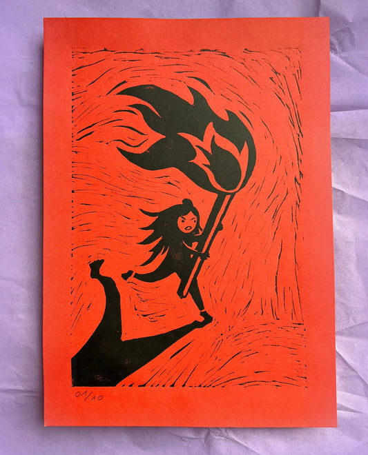 flammenmädchen – handgefertigter linoldruck
