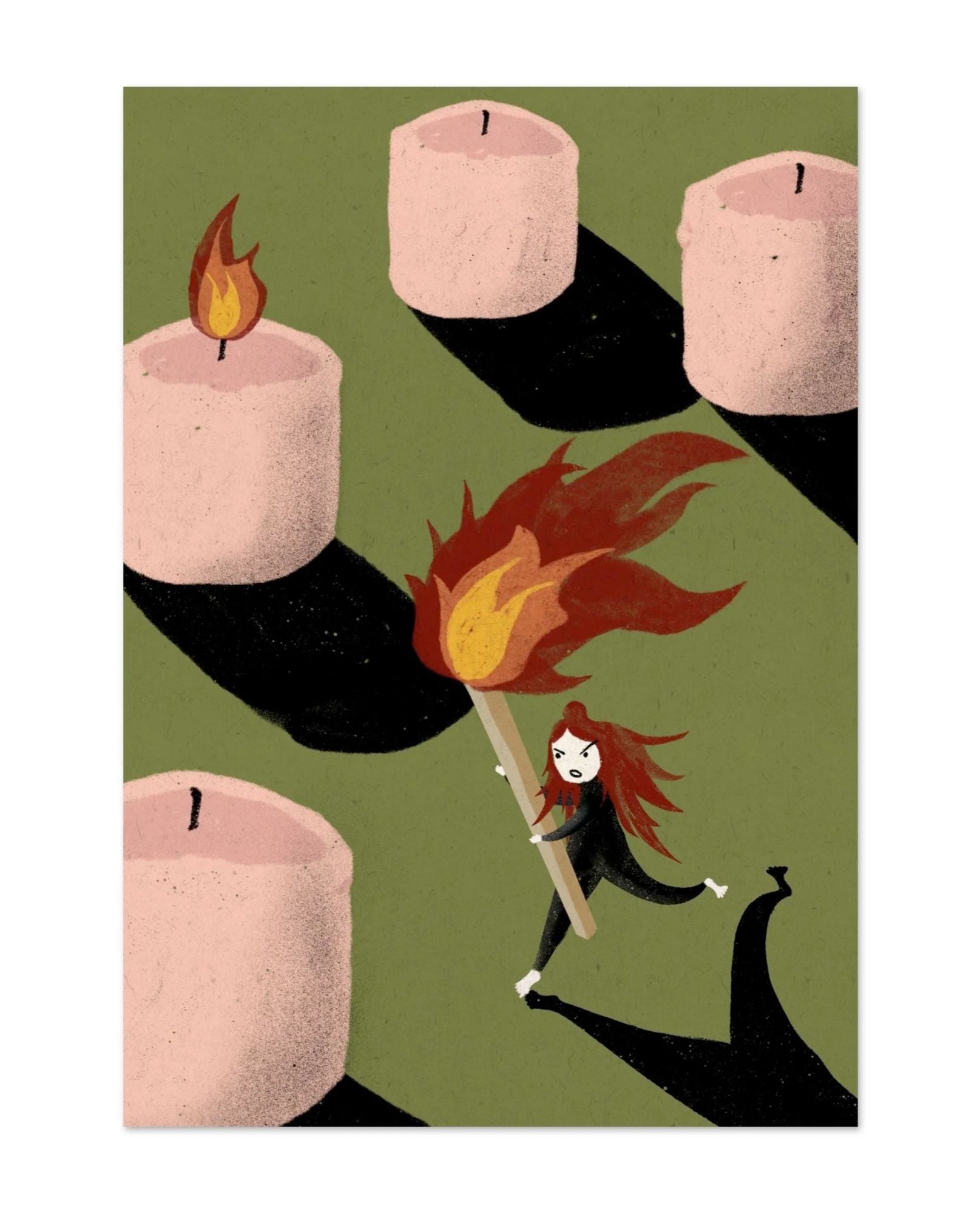 Alles anzünden – unsere kleine Flammenwerferin funktioniert wunderbar in groß als Poster, oder als kleiner Postkartengruß